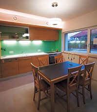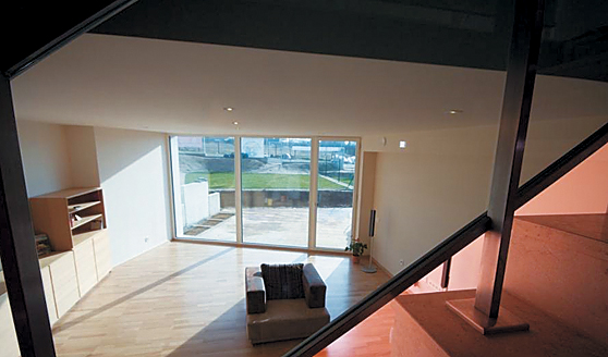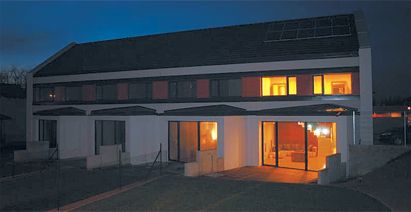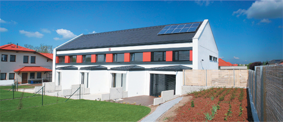 | az épület paraméterei Az építmény földszint- és tetőtér-beépítéses. Az elvégzett épületenergetikai számítás alapján (Bausoft WinWatt, MSZ EN 04-140-2) a két szélső lakás (A és D lakás) hővesztesége QA, D= 1,73 kW, míg a két belső lakás (B és C lakás) hővesztesége QB, C=1,48 kW. A díjazott passzív sorház épületgépészeti tervezési és kivitelezési munkáit a Légkomfort Kft. végezte. |