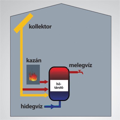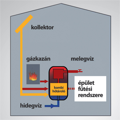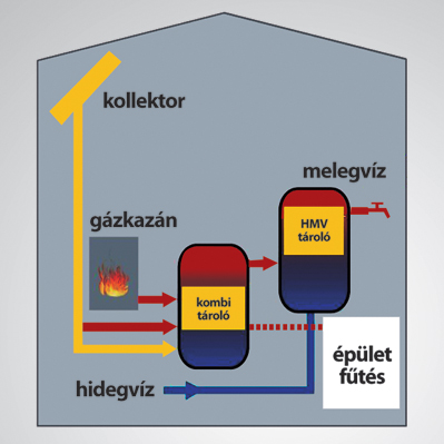 hogy az új tároló elhelyezése és bekötése általában könnyen megoldható. A „B” megoldás lényege, hogy a meglévő tárolót cseréljük. Előnye, hogy a helyszükséglet kedvező, és viszonylag kevés a tárolási hőveszteség (8. ábra). A „C” megoldás két tárolót tartalmaz (9. ábra). Az egyik, melyre a kollektort csatlakoztatjuk, két funkciót lát el. A nagyobb hőmérsékletű zónájával fűti a HMV-tárolót, a kisebb hőmérsékletű zónára kötjük a fűtési rendszert.