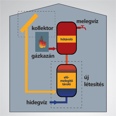 7. ábra Ennél a megoldásnál a napkollektor mellett egy előtárolót is telepítünk. Erre dolgozik a kollektor, növelve a bejövő hideg víz hőmérsékletét.