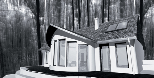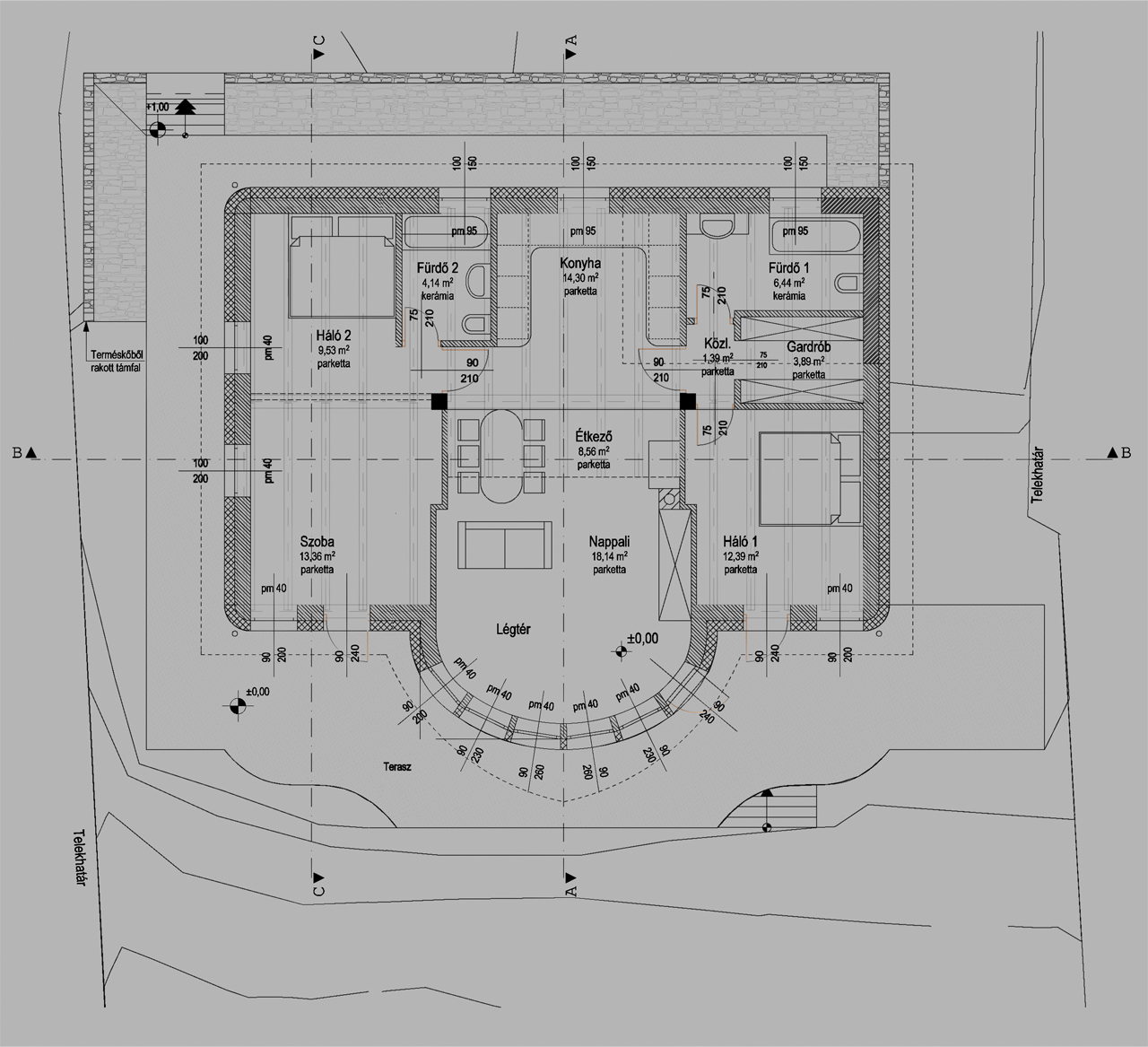 A teherhordó falak alatt üveghab hőszigetelés biztosítja a talaj felé a hőhídmentes szigetelést, ezzel kiváltható az alap köré és alá behelyezett vízálló műanyag szigetelés. Bár az üveghab előállítása energiaigényes folyamat, de az általunk választott gyártó megújuló energiát (vízenergia) használ az előállítás során, így a gyártás környezetterhelése nem nagy. A nyeregtető hajlásszö- gét a napkollektorok számára szükséges optimális dőlésszög határozta meg, szerencsére ez egybevágott a helyi építési szabályzat előírásával is.