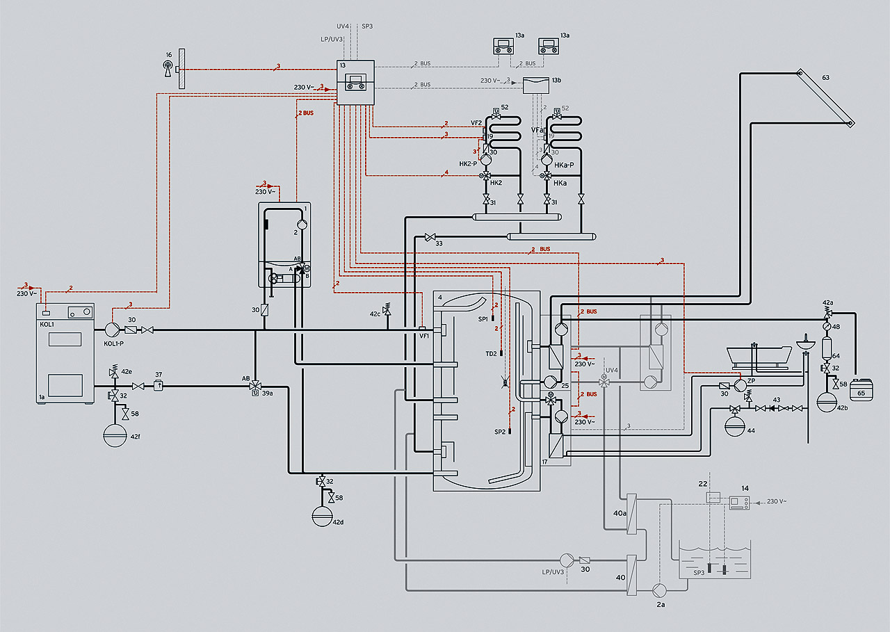 A kollektorok (63) által begyűjtött hőmennyiséget a szolár állomás (25) adja át a puffertároló felé (7), melynek fűtővizét az állomás lemezes hőcserélője melegíti fel. A szolárkör térfogatárama a termelt hőmennyiség függvénye, amely ezt követően – saját hőmérséklete alapján – a puffertárolóba rétegződik. A szo-lár töltőállomás az üzemeltetéshez szükséges minden érzékelőt, működtetőt, elektromos egységet magában foglalja, elektromos vezérlőegységgel, biztonsági szeleppel, légleválasztóval együtt. Ennek köszönhetően nincs szükség hőmérsékletérzékelő utólagos elhelyezésére a kollektorban. Ezenkívül a szolár töltőállomás a szükséges térfogatáramot önműködően szabályozza, ezért nem kell semmilyen beállítást elvégezni. A szolár állomás mindig arra „törekszik”, hogy a begyűjtött napenergiát a puffertárolóba juttatva felhasználható hővé alakítsa. Ennek a feladatnak az ellátására a puffertároló maximális hőmérséklete akár 95 °C is lehet. A központi rendszerszabályozó (13) segítségével ez az érték behatárolható, az aktivált szolár kalendárium pedig arra szolgál, hogy az évszakok függvényében csak akkor lépjen életbe a fokozatmentes szolárköri szivattyú periodikus működése, amikor szolár nyereség feltételezhető. A szolár állomás puffertöltő szivattyúja csak abban az esetben aktiválódik, ha a szolárkör kellően magas hőmérsékletű közeget tud a lemezes hőcserélőn keresztül átadni. A szolárkör nyomásingadozásait külön tágulási tartály (42b) egyenlíti ki, ahol a tartály membránját előtéttartály (64) védi a magas hőmérsékletek ellen.