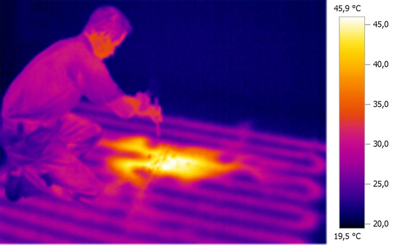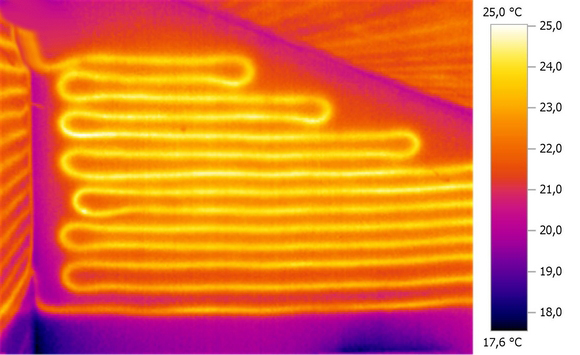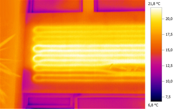 A hőkamera mindig az első felület hőmérsékletének eloszlását jeleníti meg, így a felületfűtések működése csak a felfűtési fázisban vizsgálható. A beszabályozás során az előremenő és visszatérő ági hőmérsékletek paraméterezése fontos a rendszer hatásfokának optimális beállításához, mert adott csőszakaszok eltömődése vagy a keresztmetszet szűkülése esetén a teljesítmény romlik. A hőkamerás vizsgálattal azonnal láthatóvá válnak a csőrendszer anomáliái, és azok azonnal kijavíthatók.