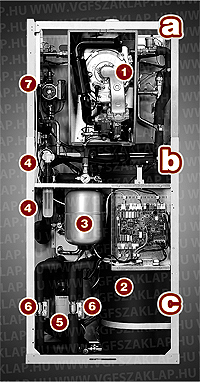 1. ábra. A zeolit-gáz-hőszivattyú fő alkotóelemei. a. Gázüzemű kondenzációs egység. 1: gázüzemű kondenzációs tűztér b. Moduláris szerelési rendszer. c. Zeolit-egység. 2: zeolit-modul (hermetikusan elzárt – adszorberrel/deszorberrel és kondenzátorral/párologtatóval, valamint vízzel, illetve zeolittal töltött – nemesacél tartály) 3: a primer kör tágulási tartálya (zeolit körnek is nevezik); 4: a primer kör szabályozott egyenáramú szivattyúi; 5: fordulatszám-szabályozott szolár szivattyú (párologtató és kondenzátor); 6: váltószelepek 1+2; 7: fordulatszám-szabályozott fűtési szivattyú. |