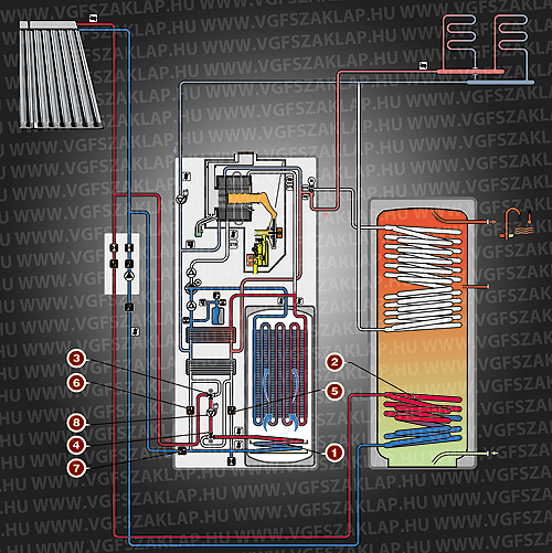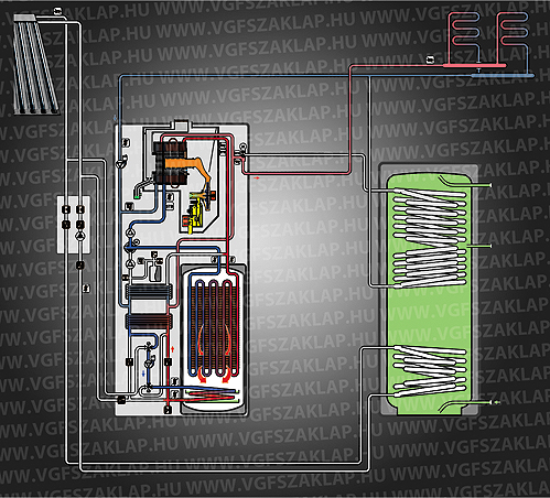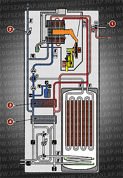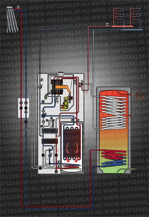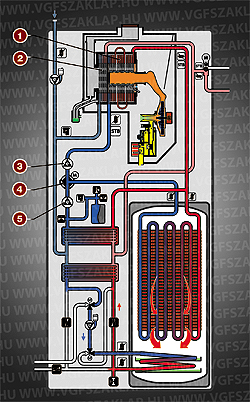 A fűtésköri szivattyú (2), valamint a háromutas váltószelep (1) is a készüléken belül helyezkedik el (3. ábra). Ezenkívül szükség van még az 1-es és 2-es lemezes hőcserélőre is (3-as és 4-es tétel), hogy a készülék a keletkező hőmennyiséget (az üzemállapotok szerint) a megfelelő hidraulikus körből felvehesse, valamint leadhassa a fűtési rendszer felé.