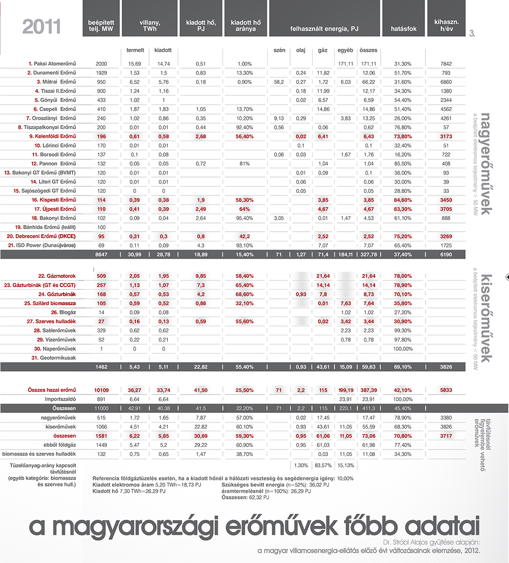 Kiindulásul. A kapcsolt rendszer és a távfűtés nem azonos fogalmak, az elektromos áramtermeléshez kötött hőtermelés gyakran technológiai igényeket szolgál, és a távfűtés sem csak a kapcsolt rendszerekre támaszkodik; vannak tisztán kazános, esetleg hulladékhőre vagy geotermikus energiára támaszkodó megoldások is. A kapcsolt rendszerű távfűtés általában kiegészül kazános egységekkel is. Mivel a kapcsolt távfűtés az áramtermelésen alapszik, a hőszolgáltatók ilyenkor az erőművek. Az energetikusok ezeket a beépített elektromos teljesítmény szerint csopor- tosítják, ha ez nagyobb, mint 50 MW, nagy-erőművekről, ha kisebb annál, kiserőművekről beszélnek. 2011-ben 21 nagyerőművet tartottak számon, ebből 13 termelt hőt is. Ebből én (önkényesen) csak négyet kötöttem a távfűtéshez, azokat, ahol a kiadott teljes energiából a hő aránya a 20 és a 80% közé esett, az összhatásfoka legalább 70% volt, és az éves kihasználtsága elérte a 3000 órát. Pakson vagy a Mátrai Erőműben, mivel nincs a környéken számottevő távfűtési igény, a termelt hő aránya 1% alatt van, míg a dunaújvárosi ISD Power vagy az ajkai Bakonyi Erőmű ipari hő termelésére épült, itt az elektromos energia a „melléktermék”. A pécsi Pannon Erőmű termelését már majdnem teljesen kiváltotta a biomassza-tüzelésű, így központilag még támogatott Pannongreen kiserőmű, az éves kihasználtsága alig 8%, ezért nem került fel a listára. Persze a fentiekhez kapcsolódó távfűtést is értékelni kellene, csak nem tudjuk, hogyan.