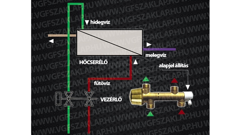 A vízmelegítéssel szemben támasztott követelményeknek való megfelelés egyik lehetősége a vezérlés alkalmazása. Eltekintünk a belépő hőmérsékletek változásától, csak a térfogatáramok hatását vesszük figyelembe. Nyilvánvaló a primer és szekunder oldalon mérhető térfogatáram közötti összefüggés. Ha több hideg vizet kell felmelegíteni, ehhez több fűtővízre van szükség. Értékpárokról van szó, a két térfogatáram összetartozó értékeiről. Ez azonban mindig meghatározott belépő hőmérsékletekre vonatkozik. Ha akár az egyik, akár a másik hőmérséklet más értéket vesz fel, az eredmény hibás lesz. A meleg víz hőmérséklete vagy nagyobb, vagy kisebb lesz a szükségesnél. Ettől függetlenül a térfogatáramokra alapozva már vízhőmérséklet-vezérlést lehet készíteni. Ha a vízhőmérsékletek közelítőleg azonosak a térfogatáramokra vonatkozó összefüggésben szereplő értékekkel, akkor a vezérlés jól működik. A meleg víz hőmérséklete – rész- vagy teljes terhelésnél – közel állandó lesz. A vezérlés elég egyszerűen, segédenergia nélkül megvalósítható (1. ábra). A hideg víz áthalad egy mérőperemen. A mérőperem két oldala között nyomáskülönbség lép fel. Ezt egy membránra vezetjük. A membrán rugó ellenében szeleprudat mozdít el. A szeleprúd, illetve a hozzá tartozó, a fűtővízvezetékbe szerelt szelep helyzete határozza meg a fűtővíz térfogatáramát, végső soron a meleg víz hőmérsékletét.Ez a szerkezeti megoldás ezen túlmenően üzemmódváltó is. Ha nincs melegvíz-használat, lezárja a fűtővíz útját, csapoláskor indítja a fűtővizet. (Ismerős megoldás; az átfolyós gáz- vagy villanybojlereknél is használatos.) További előnye, hogy könnyen kialakítható vízmelegítésre előnykapcsolás. Ez úgy valósul meg, hogy csapoláskor a membrán szeleprúdja zárja a fűtési rendszerben a keringtetett víz útját. Fűtés csak akkor lehetséges, ha nincs hidegvíz-áramlás, a membránra nem jut nyomáskülönbség, ezért nem is tudja gátolni a fűtési körben a keringtetést.
