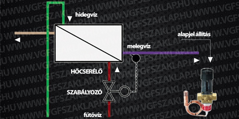 A kívánt, a térfogatáramtól függetlenül állandó hőmérsékletű meleg víz biztosítható szabályozó beépítésével is. A hőcserélőből kilépő víz hőmérséklete a szabályozott jellemző. A beavatkozás a fűtővíz térfogatáramának változtatásával történik. Analógiát erre is találunk: melegvíz-fűtésnél a radiátorok szabályozását. Azonban nem csak az a különbség, hogy a radiátor víz-levegő hőcserélő. Nagy az eltérés abban, hogy a helyiség hőmérsékletének változási sebességére sokkal kisebb követelmény vonatkozik. Nem várjuk el, hogy egy esetleges fűtésszüneteltetés után a helyiségben a hőmérséklet egy-két perc alatt érje el a kívánatos értéket. Ezzel szemben a használati meleg vizet előállító hőcserélőnek a csapoló megnyitása után nagyon rövid időn belül az előírt hőfokú vizet kell szolgáltatnia.A radiátorszelephez hasonlóan a feladat megoldható segédenergia nélkül működő termosztatikus szeleppel. Az érzékelő ebben az esetben nem a szeleptestben van, hanem külön, a hőcserélő csonkjánál beépítve (2. ábra).