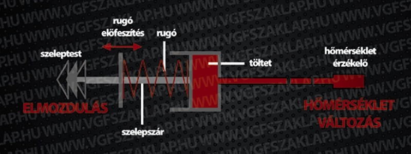 A működési elv egyszerű: az értéktartó szabályozás úgy valósul meg, hogy növekvő melegvíz-hőmérsékletre a szeleptest zárás, csökkenő hőmérsékletre nyitás irányba mozdul. A fűtővíz térfogatáramának csökkenése, illetve növekedése állítja helyre az egyensúlyt, stabilizálja a hőcserélőből kilépő víz hőmérsékletét. A szeleptest helyzetét a szelepszárra ellentétes irányú erővel ható rugó és töltet határozza meg. Állandósult állapotban a két erő egyenlő, a szelepszár és a szeleptest mozdulatlan (3. ábra).A töltet térfogata, ennek megfelelően az ebből eredő erő az érzékelő – a felmelegített víz – hőmérsékletétől függ. Ha megváltozik a víz és ezzel együtt az érzékelő hőmérséklete, a töltet térfogata és a rugóra ható ereje is módosul. Kisebb hőmérsékletnél a csökkenő erő kevésbé tudja a rugót összenyomni, a rugó hossza nagyobb lesz, elmozdítva a szelepszárat és a szeleptestet is. A szabályozó tehát úgy működik, hogy a hőmérsékletváltozás a szeleptest elmozdulásával jár. Ez arányos a hőmérsékletváltozással, ezért a termosztatikus szelep arányos szabályozó. Két szélső helyzete van: a teljes nyitás és a teljes zárás. A nyitáshoz és a záráshoz is tartozik egy érzékelő (meleg víz) hőmérséklet. A két hőmérsékletérték között van a szabályozó arányossági tartománya.A szeleptest változtatja a szelepen átfolyó víz térfogatáramát. Ez függ a szelep áramlási ellenállásától, de függ a rendszerben kialakuló nyomáskülönbségektől is. Szabályozási szempontból az a jó, ha a szelep külső zavaró körülményektől független működését nyomáskülönbség-szabályozással biztosítjuk.