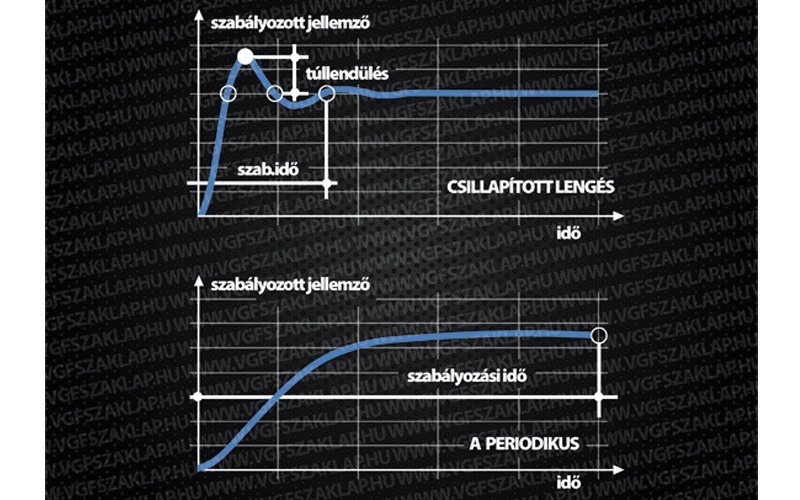 Azt, hogy a szabályozott jellemző zavarás hatására történő megváltozását milyen mértékű visszacsatolás ellensúlyozza, azt a jelváltozások „erőssége”, a szabályozási kör erősítése határozza meg. Ha az erősítés nagy, akkor a rendszer gyorsan és erőteljesen reagál, a szabályozott jellemző változása gyors. Fordítva, kis erősítés lassú változást idéz elő. Kellően nagy erősítésnél a meleg víz hőmérséklete gyorsan változik (pl. növekszik), azonban túl is lépi a kívánt értéket. Túllendülés következik be. Jó esetben csillapodó lengéssel éri el az állandósult állapotbeli értéket (4. ábra). Ez ugyan eltér az előző nyugalmi állapotban mérhetőtől, de a különbség a nagy erősítés miatt csekély. Csökkentve az erősítést, a túllendülés mértéke is csökken. Elérkezünk ahhoz az esethez, hogy a hőmérséklet túllendülés nélkül, ún. aperiodikus függvény szerint változik. A kisebb erősítés miatt a maradó eltérés viszont nagyobb lesz. A szabályozási idő is hosszabb. Indokolt tehát az erősítést nagyra választani. Nagyra, de nem túl nagyra, abban az esetben ugyanis a túllendülés is nagy lenne, sőt a lengések nem csillapodnának. A rendszer állandó lengésben maradna, a vízhőmérséklet folyamatosan ingadozna. A szabályozó szünet nélkül mozgásban lenne, gyorsan elhasználódna, meghibásodna. Fontos feladat tehát a szabályozót és a hőcserélőt úgy méretezni, hogy az erősítés a megengedhető értéket ne lépje túl. Egyébként magának a túllendülésnek ennél az alkalmazásnál nincsen különösebb hátránya.