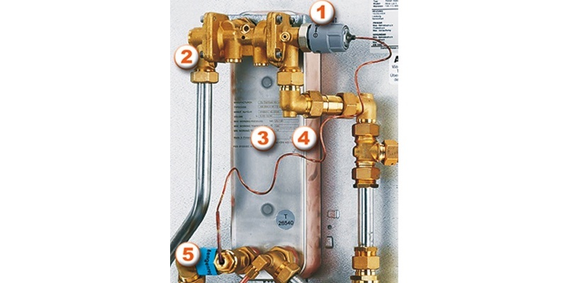 5. ábra: A jó szabályozáshoz szükséges elemeket együtt tartalmazza a vízátfolyás-kompenzált hőmérsékletszabályozó beépített nyomáskülönbség-szabályozóval 1. termosztatikus szelep; 2. hidegvíz-belépés; 3. hőcserélő; 4. fűtővíz-belépés; 5. melegvíz-kilépés hőmérséklet-érzékelő