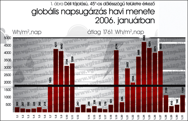 A területi különbségek mértéke Magyarországon belül mindössze +/-5%. Igaz, ez az az időjárási érték, ahol az átlagnak a legkisebb a jelentősége. Nézzük, hogyan jött ki 2004. januárban az 1761 Wh/(m2/nap) átlagos napi sugárzás (1. ábra). Szemlátomást nincs az a területe a szakmánknak, ahol a havi, évszakos vagy éves átlagok használható információt adnának. Méretezésre legalábbis a napi adatok szükségesek. Legszeszélyesebb időjárási jellemzőnk, a csapadék éves összehasonlításban nem nagyon tért el az átlagtól, voltak annál csapadékosabb és szárazabb évek. Az egyetlen szomorú kivétel 2003, amikor a szokásosnak csak a háromnegyede esett. A havonkénti bontásban persze megnőnek a különbségek, vannak teljesen száraz hónapok, és vannak, ahol a csapadék az átlagos érték háromszorosa. Zalában 20%-kal több, Csongrádban 20%-kal kevesebb esik az országos átlagnál.
