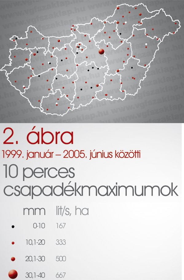 A csapadék mennyiségével egy épületgépész két esetben szokott találkozni. Az egyik, amikor ún. „szürke” (tiszta, de nem ivóvíz-minőségű) vízként gyűjteni, felhasználni akarjuk. Ehhez elég jól felhasználhatók a havi átlagok. A másik, gyakoribb eset, amikor a csapadékvíz elvezetéséről kell gondoskodni. Mivel a hatályos, angol nyelvű EN 12056-3 szabványhoz nem rendeltek méretezési csapadékértéket, általában a már visszavont MSZ 04 134 alapján, Budapesten a négyéves, máshol az egyéves gyakoriságú, nagy intenzitású, tízperces zápor hozamával szoktunk számolni. Ennek a megoldásnak sohasem értettem meg a mélyebb, mögöttes tartalmát (Németországban, tájegységtől függetlenül 300 lit/s,ha, Franciaországban 500 lit/s,ha értékkel számolnak). Sajnos az egész országra kiterjedő, percpontosságú mérés csak kb. tíz éve folyik, igazán nagy adatbázis még nem áll rendelkezésre (2. ábra). Mint az ábrából látszik, még ilyen rövid időszakot figyelembe véve is, a rövid, de nagy intenzitású zápor az ország minden területén közel azonos valószínűséggel fordul elő. Ugyanez a kérdés egy kicsit eltérő megfogalmazásban, 25 év mérései alapján az 1. táblázatban van összefoglalva. A Németországban használt 300 lit/s,ha érték 10 perces zápor esetén a 18 mm-es csapadékmagasságnak felel meg.