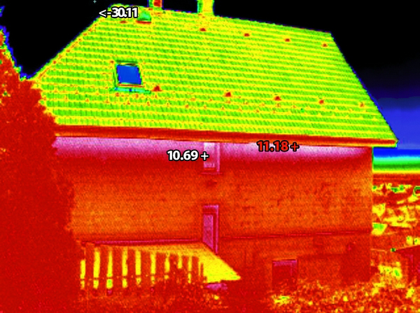 | 1. ábra A hőkamerával készült fotón egy Porotherm 38-as vázkerámiából épült családi ház látható. A képen valamennyi hőhídként működő fuga kivehető, jól mutatva azt, hogy a falszerkezet hőszigetelés nélkül nem felel meg a mai elvárásoknak. |