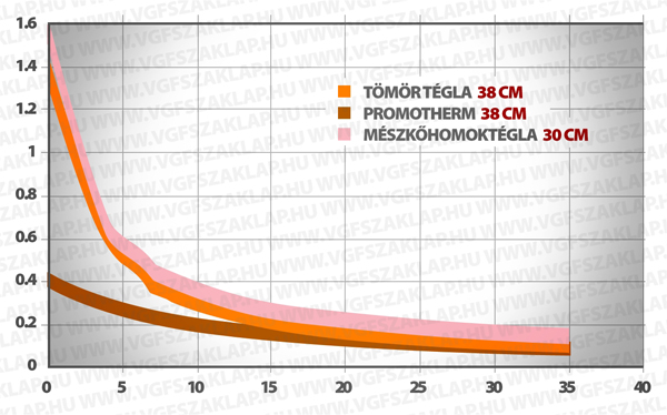 A diagramon 0-35 cm-ig vizsgáltam a hőszigetelés vastagságának hatását a falazat u értékére. Látható, hogy az első 5 cm hőszigetelés hatása drámai, de 18-20 cm-ig még mindig meredeken esik a görbe. Leolvasható az is, hogy minél rosszabb hőszigetelő a fogadó szerkezet, a hőszigetelés annál hatékonyabb. Az optimális vastagság 20 cm-re tehető, aminek nem pusztán energetikai, hanem gazdasági okai is vannak: bár 20 cm felett még hoz némi energia-megtakarítást a többlet hőszigetelési vastagság, ugyanakkor gondolni kell arra is, hogy a belső hőterhelés egy idő után túlmelegedési gondokhoz vezethet a „túlmértezett” hőszigetelés miatt. Másrészt a ma járatos (és környezettudatos szempontokat is figyelembe vevő) hőszigetelési rendszerméretek maximuma 20 cm. Természetesen az ennél vastagabb hőszigetelés rögzítése is kivitelezhető, de az egyedi megoldásokkal járó többletmunka és -költség megtérülése kérdéses. A 20 cm-től lefelé eltérni azért nem érdemes, mert a ház beállványozásával, a felerősítéssel, vakolással, festéssel járó munka mennyisége a szigetelés vastagságával nem nő vagy csökken, mint ahogyan a szigetelőanyagok ára sem nő lineárisan a vastagságukkal (a kétszer olyan vastag hőszigetelés maximum 8-16 százalékkal emeli a költségeket), így mindenképpen érdemesebb vastagabb hőszigetelést választani.