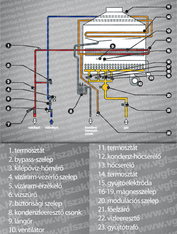 | 1. ábra: Főbb alkatrészeit, elveit tekintve készülék felépítése jelentősen nem különbözik egy hasonlóan korszerű kondenzációs készüléktől. |