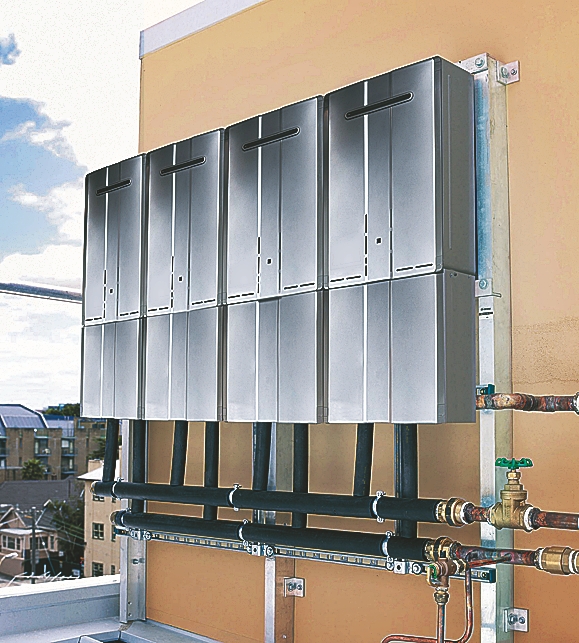 Amennyiben speciális felhasználói igények mégis magas vízhőmérséklet állandó biztosítását igénylik, úgy a kilépő hőmérséklet a vezérlőpanelen található DIP kapcsolók segítségével akár 90 °C-ra is állítható. A vízhigiéniás komfort kapcsán meg kell említenünk a legionella baktériumot, amely súlyos, magas halálozási rátával bíró tüdőgyulladást okozhat. A baktérium valamenynyi édesvízben előfordul veszélytelen koncentrációban, azonban 25 °C és 55 °C között szaporodik, és köny-nyen elérhet egy veszélyes koncentrációt. A nagyobb hőtárolós rendszereknél a tárolóban vagy a hosszabb vízvezetéki strangokban, ahol a megfelelő hőmérsékletzónák kialakulhatnak, fokozottabb figyelemmel kell kezelni azt a baktériumveszélyt, amely az átfolyós rendszerű készülékek esetében lényegesen kisebb kockázatot jelent. A kültéri változatok szintén tetszőleges számban telepíthetők falra szerelve, vagy akár épületek vízszintes tetősíkján elhelyezve. A kültéri kivitel esetén a fagyvédelemről beépített anti-frost rendszer gondoskodik öt darab kerámia fűtőelem segítségével, melyek 5 °C alatt kezdenek fűteni. Ezen készülékeknél az égéstermék-elvezetés beruházási, illetve építési költségei gyakorlatilag teljes mértékben megtakaríthatók. A legnagyobb teljesítményű készülékek mérete sem haladja meg egy átlagos, tároló nélküli fali fűtőkazán méretét.