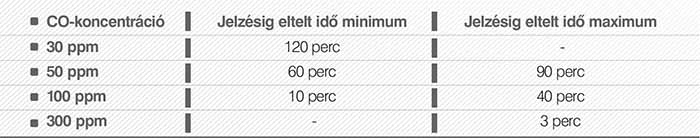 A berendezés meghibásodás-kijelzőjének – ha van rajta ilyen – sárga színűnek kell lennie. A kijelzők funkcióit a berendezésen jelölésnek kell tartalmaznia. A gyártó utasításai szerint felszerelt berendezés kijelzőinek láthatónak kell lenniük. Az alábbi (1.) táblázatban meghatározott időkorlátok között a szén-monoxid-riasztás piros kijelzőjének fényjelzést kell adnia, és egyidejűleg a vészjelző hangnak meg kell szólalnia. A berendezésnek mindaddig hang- és fényjelzést kell adnia, amíg a CO-koncentráció az 50 ppm-et meghaladja.