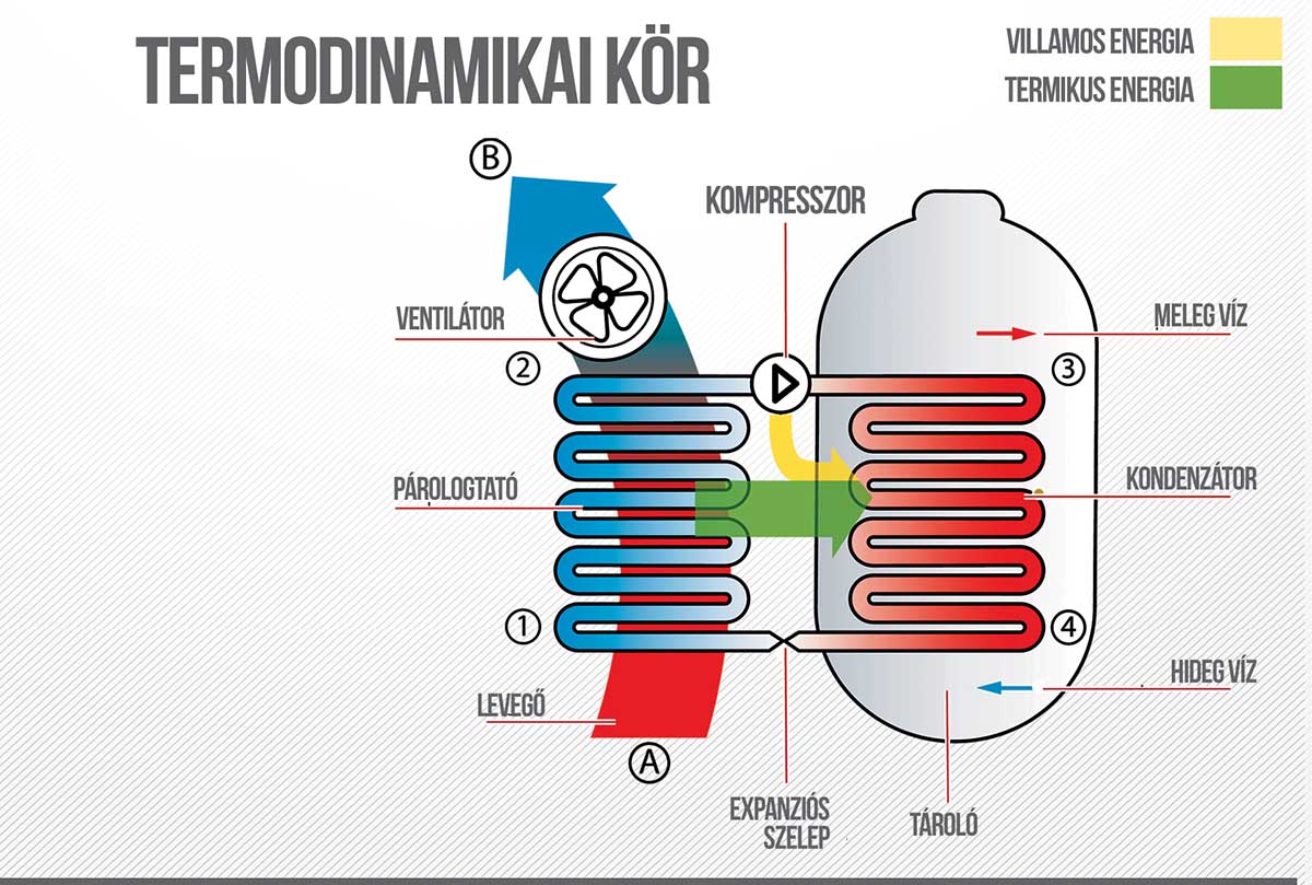 A villanybojlerek 70%-a vezérelt (anno: éjszakai) áramon működik, tehát a tisztelt tulajdonos 1 kWh áramért fizet 28 Ft-ot. Egy 120 literes tradicionális hengeres villanybojler 2 kW-os teljesítményű fűtőszállal, vezérelt áramon, egy négytagú családban közel 6500 forint havi költséget jelent. Egy HMV-hőszivattyú, ami 250 W összteljesítményű és 120 literes, ugyanolyan igények mellett 1300 Ft-os havidíjjal működik. 75%-kal kisebb energiafelhasználás! Itt ugyanis az villamos energiát hőenergiává alakítjuk át a hőszivattyú elvének alkalmazásával, ahol az alacsonyabb hőmérsékletű környezetből hőt vonunk ki, és azt magasabb hőmérsékletű helyre szállítjuk. A hőszivattyú elvileg olyan hűtőgép, melynél nem a hideg oldalon elvont, hanem a meleg oldalon leadott hőt hasznosítják, közel 3,7-4-es COP értékkel, azaz jóságfokkal.