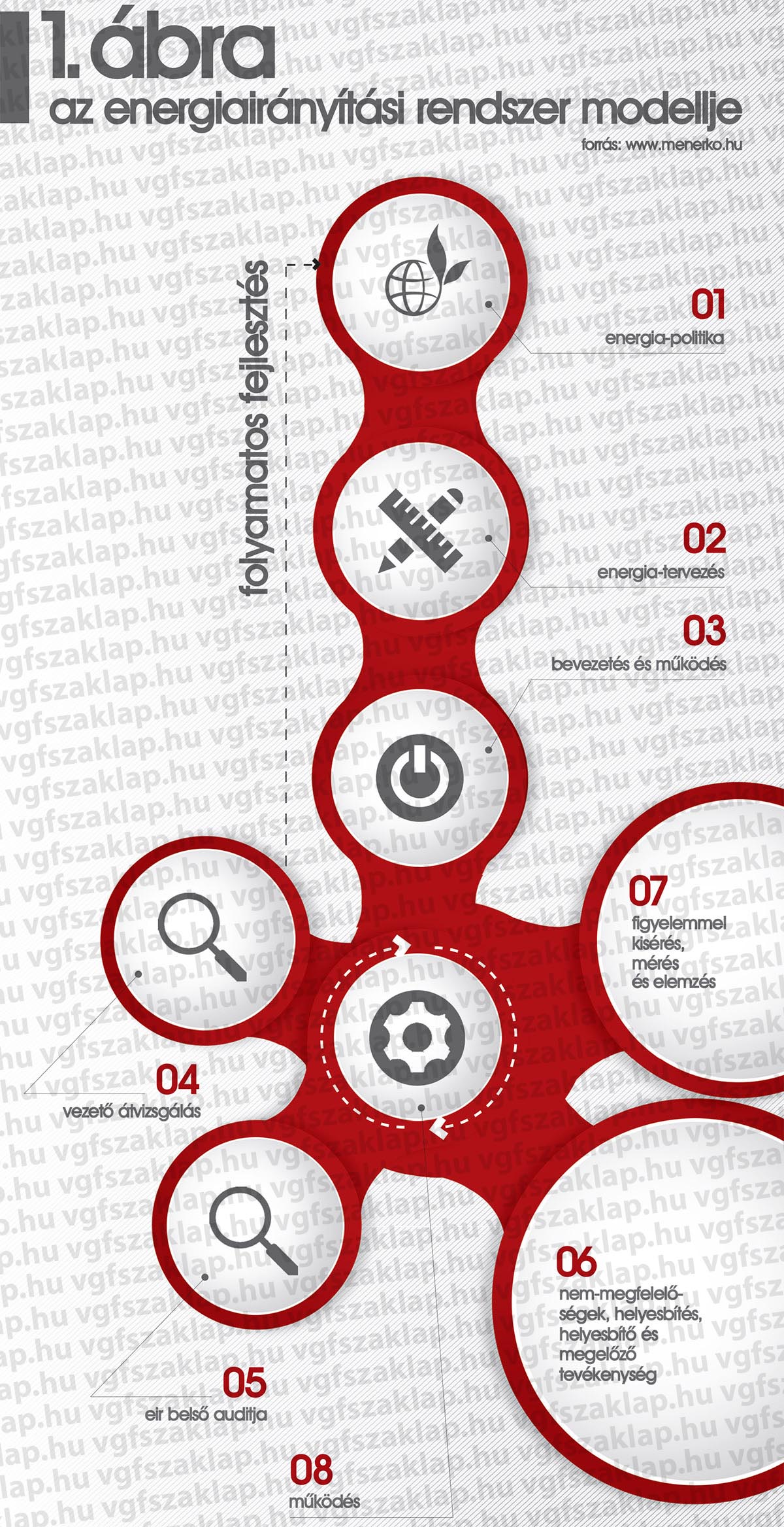 Az ISO 50001 nemzetközi szabvány a „tervezés–megvalósítás–ellenőrzés–intézkedés” (PDCA) módszerén alapul (1. ábra), amelynek segítségével a szervezet mindennapi folyamataiba beépítheti az energiairányítást. A rendszer folyamatos fejlesztési eljárásának első lépése az energiapolitika meghatározása, amely rögzíti a vállalat felső vezetésének és egyben a vállalat elkötelezettségét a folytonos energiateljesítmény növelésére.
