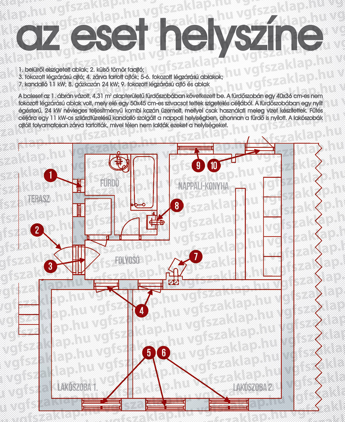 A két, alaprajzon feltüntetett lakószobában összesen három darab fokozott légzárású ablak volt. A lakószobák ajtóit folyamatosan zárva tartották, mivel télen nem lakták ezeket a helyiségeket. A fürdőszoba, a folyosó és a kandallókályha telepítési helyéül szolgáló nappali-konyha a gyakorlatban egy légteret képeztek, mivel az ajtókat nyitva tartották, hogy a kandalló a lakók által használt öszszes teret befűtse. A gázkészülék egy béléscsővel ellátott falazott kéménybe csatlakozott, kitorkollási magassága a tetőgeometriából adódóan a kandalló kéményétől kb. 0,8 m-rel alacsonyabb volt. Már az eset körülményeinek leírásából is több olyan szabálytalanság vehető észre, melyek alapján szinte törvényszerűen előre jelezhető a baleset bekövetkezése, a kérdés csak a mikor.