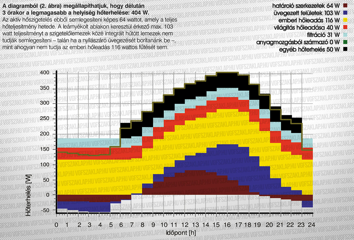 A diagramból (2. ábra) megállapíthatjuk, hogy délután 3 órakor a legmagasabb a helyiség hőterhelése: 404 W. Az aktív hőszigetelés ebből semlegesíteni képes 64 wattot, amely a teljes hőteljesítmény hetede. A leárnyékolt ablakon keresztül érkező max. 103 watt teljesítményt a szigetelőlemezek közé integrált hűtött lemezek nem tudják semlegesíteni – talán ha a nyílászáró üvegezését borítanánk be –, mint ahogyan nem tudja az emberi hőleadás 116 wattos fűtését sem. Nem újkeletű felismerés, hogy egy korszerű épület hűtésénél a legkevésbé figyelembe veendő érték a falakon keresztül érkező transzmissziós hőterhelés.
