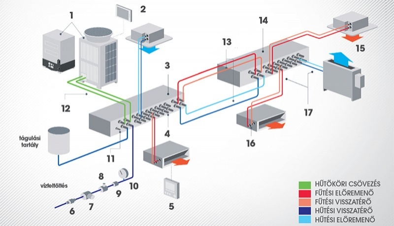 Rendszerfelépítés. 1. Kültéri egység (léghűtéses vagy vízhűtéses, 22,4-56kW); 2. Központi vezérlő; 3. Master-HBC 8 vagy 16 csonk; 4. 22 mm-es csőcsatlakozások; 5. Fali szabályzók; 6. Visszacsapó szelep; 7. Szűrő; 8. Nyomáscsökkentő szelep; 9 Elzáró szelep; 10. Nyomásmérő; 11. Csatlakozás a 2. Master-HBC egységhez ha szükséges; 12. 2 hűtőközegcső; 13. Hideg és melegvíz összekötés az Al-HBC egységgel; 14. AI-HBC 8 vagy 16 csonk; 15. Akár 50 beltéri egység (1,7-5,0 kW); 16. ¾"-os menetes csatlakozás;17. Egyidejű hűtés és fűtés biztosítása a 20 mm-es belső átmérőjű vízcsöveken keresztül.
