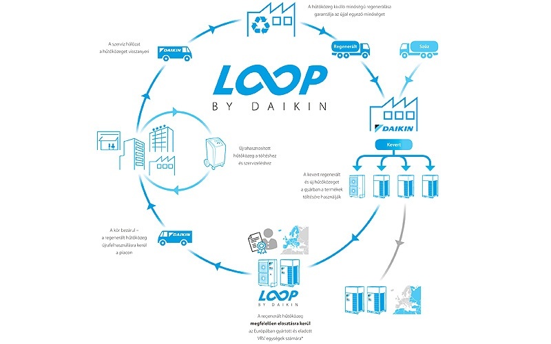 A Loop by Daikin projektben a használt hűtőközeget visszanyerik a már meglévő rendszerekből, visszaállítják az új hűtőközeggel azonos minőséget, majd az így regenerált hűtőközeget felhasználják az Európában gyártott és értékesített új VRV-egységekhez. Audit garantálja, hogy a regenerált hűtőközeg minősége megegyezik az új hűtőközegével. A független ellenőrzési folyamat azt is biztosítja, hogy a visszanyert hűtőközeget csak a Loop by Daikin védjeggyel ellátott VRV-egységek gyári töltéséhez használják fel.
