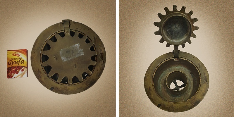 Végezetül gyűjteményünk egyik gyöngyszeme. Ahol csak tehetem, mindenütt elmondom, a régi mestereknek nemcsak az volt fontos, hogy az adott rendszer, berendezés vagy szerkezet jól működjön, könnyen legyen használható, hanem mindeközben szép is legyen. Ezt bizonyítja a 6-7. képünkön látható sárgaréz padlóösszefolyó. Jól látható az egyszerű nyithatóság, tisztíthatóság és a vízzár szellemes kialakítása.