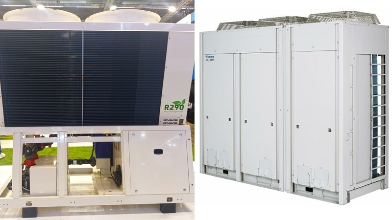 R290-nel töltött berendezésből minden méretben és típusban találkozhattunk. Jobbra: szén-dioxid hűtőközeget használó VRV-berendezés. Képek forrása: Vaillant, Daikin