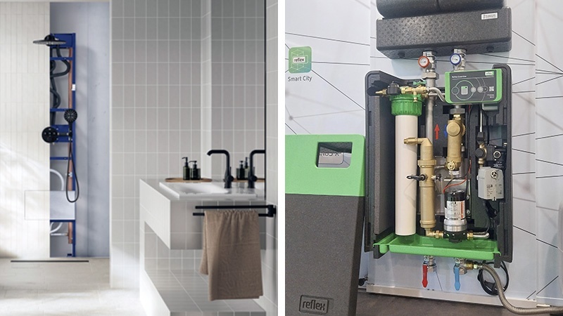 Az idei kiállításon is azt tapasztaltuk, hogy egyre nagyobb hangsúlyt fektetnek a gyártók a szerelőbarát megoldásokra. Ennek keretében komplex „gépházak” kerülnek be egyetlen dobozba, így nincs szükség bonyolult csövezésre, szerelése a falakon. Találkozhattunk például olyan megoldással, amely a teljes rendszer elemeit tartalmazta a vízkezeléshez és a hidraulikához helytakarékos dobozba szerelve az egyszerű telepítés és alkalmazáson keresztüli üzembe helyezés érdekében. A telepítése egyszerű és időtakarékos, akár padlóra, akár falra szerelhető; a tökéletesen harmonizált és előzetesen tesztelt alkatrészek abszolút megbízhatóságot és magas szintű üzembiztonságot kínálnak; kompakt és helytakarékos kialakítása tökéletessé teszi a modern telepítési helyiségekbe; a moduláris felépítésnek köszönhetően pedig szükség esetén könnyen cserélhetők az alkatrészek.