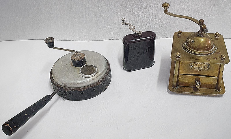 A kávédarálót valószínűleg ma még mindenki ismeri, de tapasztalatom szerint a kávépörkölőt (balra) már csak kevesen. Tudni kell, hogy kb. 60 éve a boltokban csak zöld kávét lehetett vásárolni és mindenki otthon pörkölte meg a kávéját, vagy égette el, ha nem figyelt eléggé.